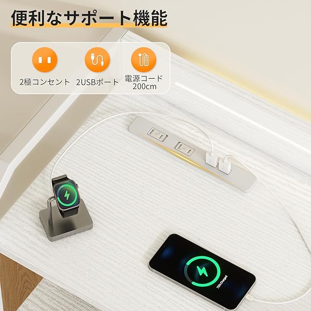 【USBポート付きで便利に充電】2口のコンセントと2つのUSBポートを搭載しており、最大4台のデバイスを同時に充電可能です。合計1450Wの電力をサポートしているため、加湿器、ライト、電動歯ブラシなどの小型家電の充電がとても便利にできます。配線の煩わしさを解消し、すっきりしたデスク周りを実現します。