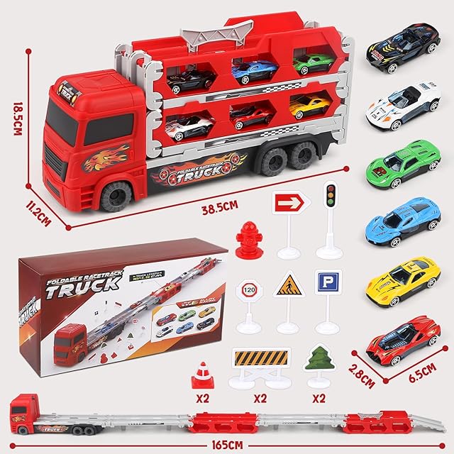 【22PCSおもちゃの車セット】 - 大型おもちゃのトラック1台、合金製メタルミニカー 6個、カスタムステッカー3枚、道路標識アクセサリー12個が含まれています。子供 の 車 おもちゃ には、丈夫で落下に強いABSプラスチック素材で作られた6つの車輪も装備されています。