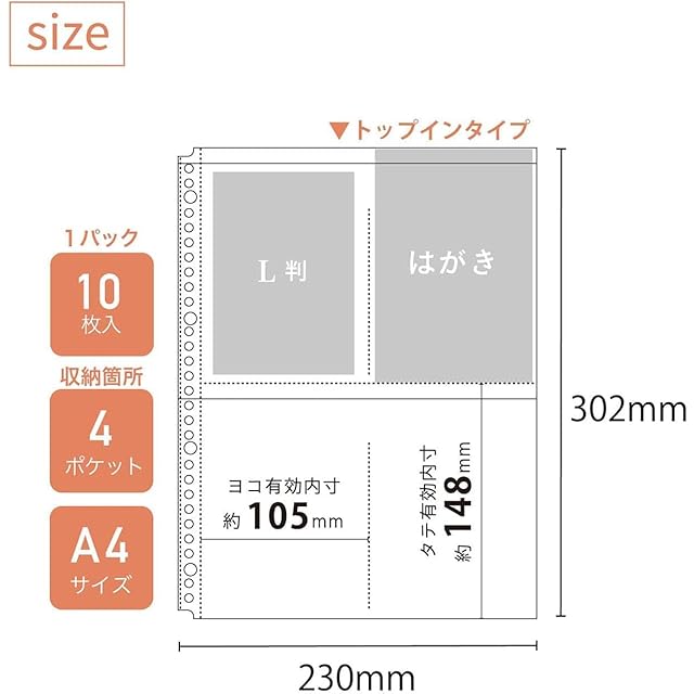 【商品説明】 ○バリエーション豊かなラインナップで、様々なコレクションや小物の整理に。 ○トップインタイプ。 ○片面ポケット。 ○チケットや領収書が入る。 【詳細】 ・本体サイズ:302×230mm ・サイズ:A4 ・タイプ:S型4ポケット ・穴数:30穴 ・10枚入り