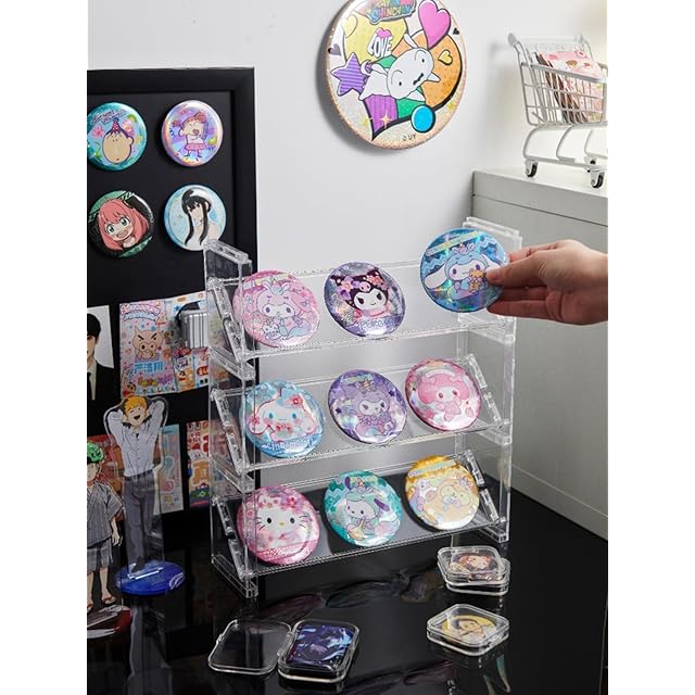 OTYTY 缶バッジディスプレイ棚 バッジ展示台 バッジ収納棚 9枚収納可能 アクスタ バッチ収納 収納ラック 全クリア 【44mm・56mm・75mm・90mm】対応 陳列棚 大容量 ディスプレイ 展示 おしゃれ 落下防止 3段階収納 飾る 卓上 表彰メダル 飾る 推し活 オタ活 アニオタ アニメグッズ飾り ネイル・小物・雑貨収納 耐久性 鑑賞に最適