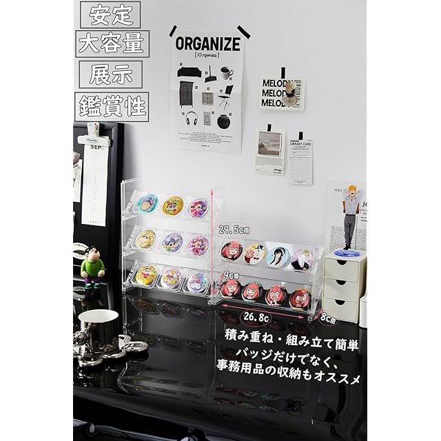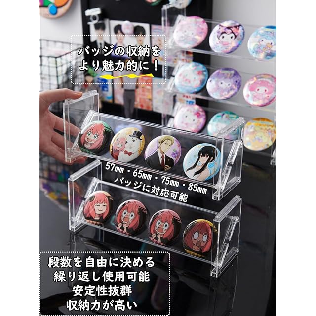 【商品仕様】本体寸法:26.8cm(長さ)*8cm(幅)*29.5cm(高さ) 缶バッジ対応範囲:44mm・56mm・75mm・90mm カラー:クリア(アクリル、高透明度)。本製品はバッチを別々に収納し、三段階調節可能です。お気に入りの推しキャラの缶バッジをキレイに飾れるディスプレイケースです。缶バッジを斜めに支える構造で前倒れを防ぎ絵柄も見えやすくなっています。一つずつ分けてディスプレイできるので同じ場所に並べたり、各部屋に飾ったりと色々楽しめます。また、積み重ねも可能で、レイアウトの幅が広がります。