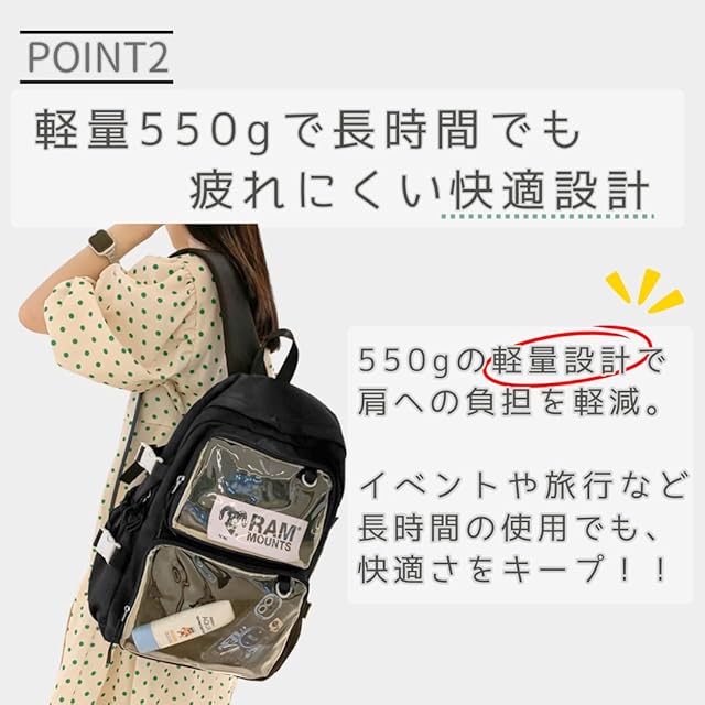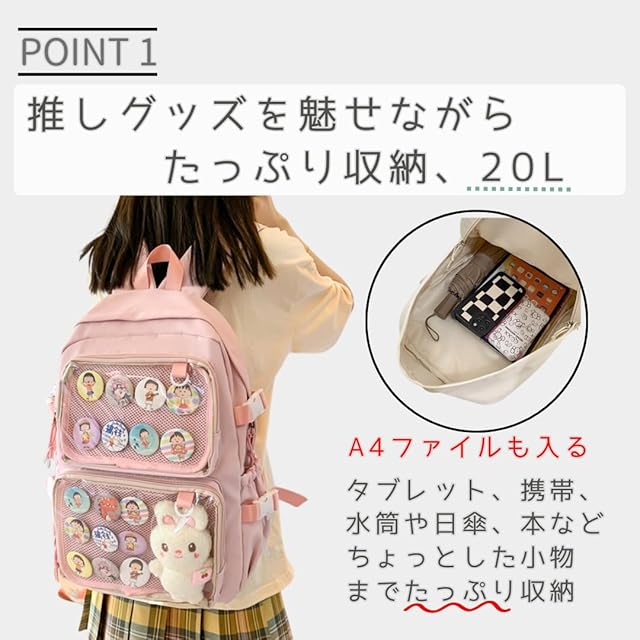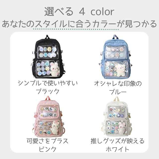 推し活をもっと楽しむために生まれた推し活リュック。 透明ポケット付きのデザインは、推し活グッズを美しく魅せながら収納するのに最適です。 お気に入りの缶バッジやぬいぐるみ、アクスタをセットすることで、自分だけのオリジナルの痛バッグ リュックが完成します。 イベントやライブだけでなく、日常のオタ活や通学にもぴったりな機能性が光るレディース リュックです。 地雷系 リュック としても人気で、話題のアイテムとして注目されています。 この 痛 バッグ の最大の魅力は大容量設計。 A4サイズのファイルやタブレット、水筒、折りたたみ傘などもしっかり収納できるため、痛バッグとしての実用性も抜群です。 痛バッグランキング でも人気の バッグ は、推し活かばんとして多くのファンに支持されています。 収納スペースはメインだけでなく、透明ポケットやサイドポケットも充実。 特に 痛バッグぬいぐるみ や小物を飾りたい方におすすめの仕上がりとなっています。 さらに、軽量設計で肩への負担を軽減。約550gの軽量仕様で長時間の使用でも疲れにくい快適なデザインが特徴です。 地雷系 バッグや痛バリュックとして愛用されるだけでなく、普段使いにも最適。 推し活バッグとしての機能を重視しながら、シンプルなデザインで幅広いコーディネートにマッチします。 撥水加工を施した素材を採用しているため、突然の雨にも安心です。 大切な推しグッズを水濡れから守り、透明リュックの魅力を最大限に活かした設計になっています。 推し活バックとしての日常使いはもちろん、通学バッグや旅行用バッグとしても活躍する多用途な万能リュックです。 選べる4色展開で、ブラック、ブルー、ピンク、ホワイトからあなたらしいスタイルに合うカラーが見つかります。 痛バッグピンクは特に可愛さをプラスしたい方にぴったり。 痛バ 隠せる 機能や推しバッグとしての収納力、デザイン性を兼ね備えています。 自分だけの 推し活 をより充実させるためのバッグとして、ぜひチェックしてみてください。 推し活ぬいぐるみバッグとしても使えるこのアイテムは、オタ活に最適な逸品。 痛バのファンにもおすすめできる実用性とデザイン性の両立が魅力です。