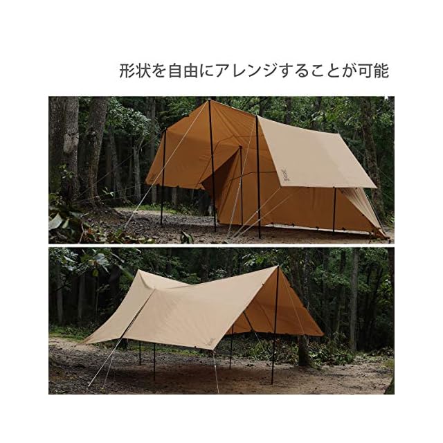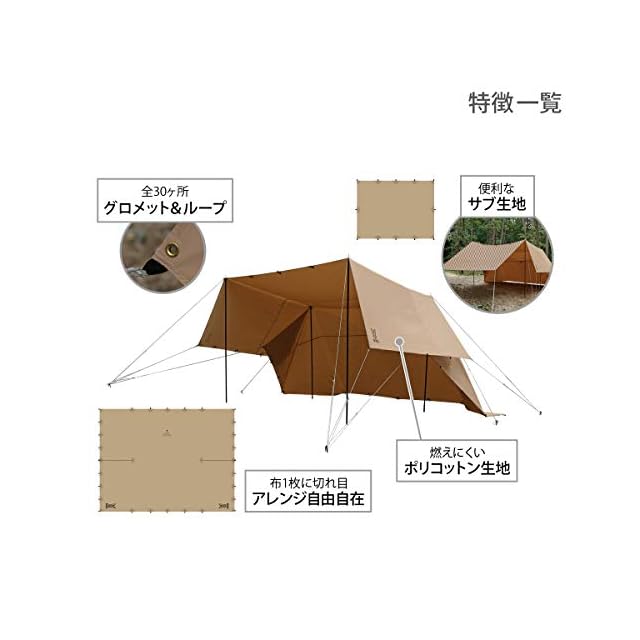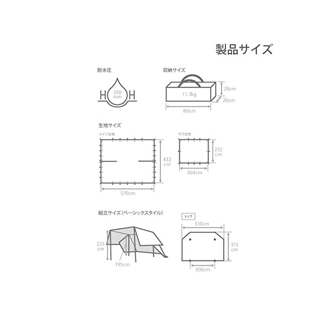 ※ 本製品に使用されているポリコットン生地は、防水コーティングされたポリエステル生地などとは異なり、水分を吸収した際に綿素材が膨張し、雨漏りを防ぐ構造です。そのため、張り方が弱いときや、長時間の雨に濡れた際には内部に雨漏りする場合があります。また、濡れたまま保管をすると科学繊維に比べてカビが生じやすいためご注意ください。