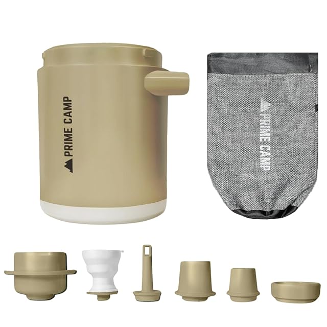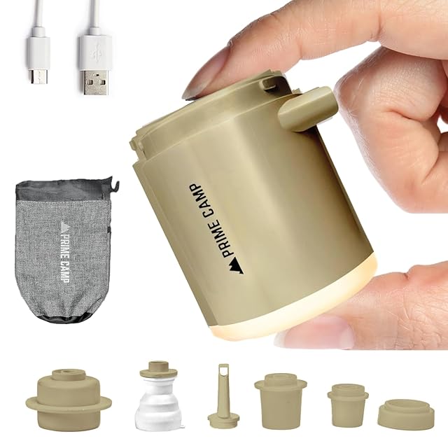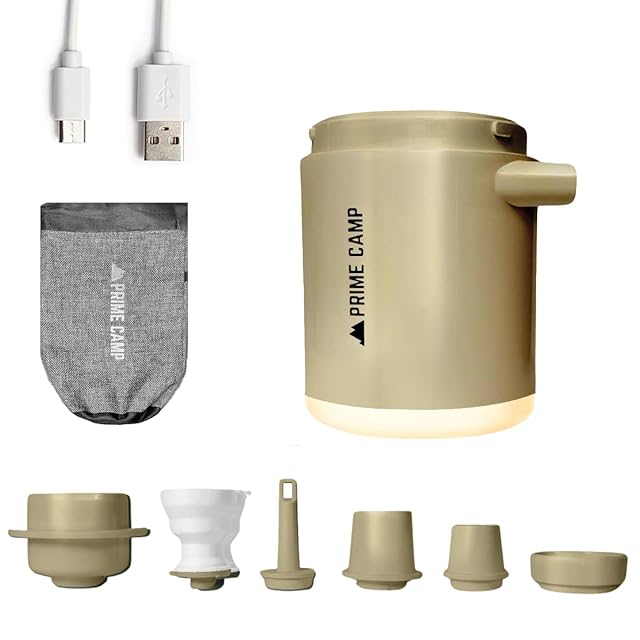 キャンプ エアーポンプ 電動 空気入れ 超軽量 強力170L/分 【6つのノズル&ライト付】 エアポンプ 1360mAh大容量バッテリー USB充電式 空気抜き インフレーターマット キャンプ 浮き輪 (タン)