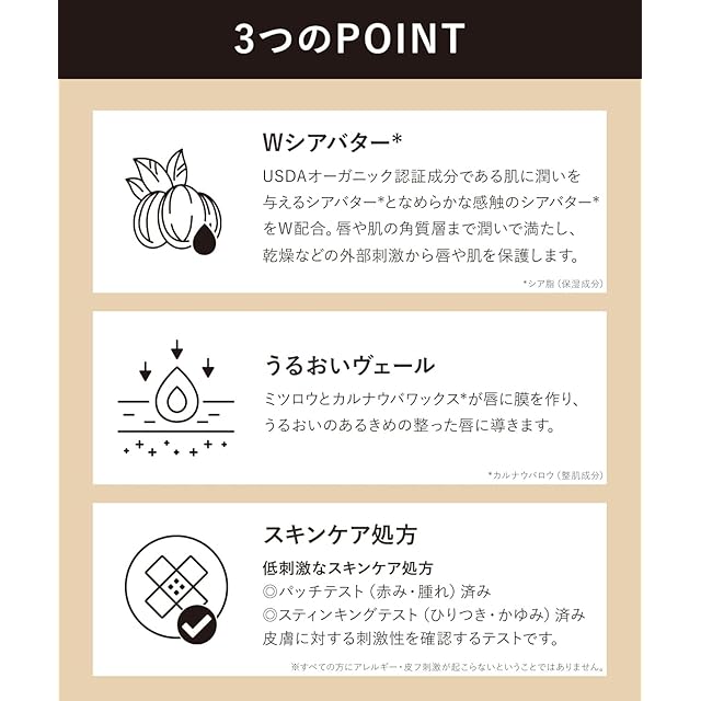 Wシアバター*と高保湿成分配合で唇の荒れを防ぎ、ハリのあるなめらかな唇へ導きます。低刺激なスキンケア処方、8種類のフリー処方。 *シア脂(保湿成分)