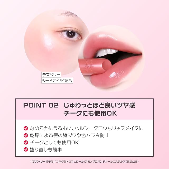 【保湿ケアしながら美発色】ラズベリーシードオイル*配合で乾燥を防ぎ、しっとり感をキープ。* (ラズベリー種子油/コハク酸トコフェロール)アミノプロパンジオールエステルズ(整肌成分)