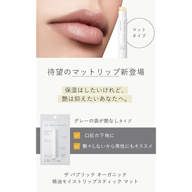 保湿はしたいけれど、艶は抑えたいあなたへ。唇にするするとなじみ、しっかりと潤いを与えながらナチュラルなマット質感に整える「THE PUBLIC ORGANIC 精油モイストリップスティック マット」