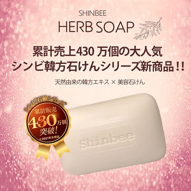 【 仕様 】 <br>■内容量 : 85g <br>■入数:1個 <br>■製造 : 韓国 <br>■販売元 : 株式会社シンビジャパン<br><br>【 優しい香りのシンビ韓方NEWハーブ石鹸が新登場 】 <br>大人気ロングセラーのシンビ韓方ハーブ石鹸に、香りの優しいタイプの石鹸が登場!!今までのshinbee韓方ハーブ石鹸で香りが強いと思われた方にも安心してお使いいただけます!<br><br>【 韓方天然成分ですこやかな美しい肌へ 】 <br>シンビ韓方ハーブ石鹸はふっくらしたきめ細かな泡が毛穴の汚れを洗い流し、お肌本来の力を引き出すお手伝いをします。韓方エキスが素肌を健康的に守ります。シンビの石鹸はお風呂場の中に置いたままでも溶けにくいので、最後のひとかけらまでしっかり使うことができます。<br><br>【 洗顔・ボディ洗浄・石鹸シャンプーなど全身にお使いいただけます 】 <br>つるんとなめらか、全身洗えてさっぱり美肌。ふわふわ柔らかい泡が簡単に作れます。泡切れがとてもよく、 お顔だけでなく体を洗う時も気持ちがいい石鹸です。毎日の洗顔で時々出るトラブルや乾燥からくる肌荒れを対策し、毛穴汚れの汚れを落とします。軽いメイクは二度洗いしてください。<br><br>【 石鹸洗顔がお肌に良い理由 】 <br>石けんの泡の界面活性の力は クレンジングフォームやクレンジングオイルなどの合成界面活性剤とは違い、 大量の水に触れるとその力はなくなり洗い流されてしまいます。つまり、泡の状態ではお肌の上にあるメイクの油分やお肌の汚れは分解しますが、 泡が水に流されればお肌の上に界面活性剤が残らない状態になります。