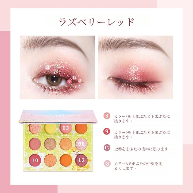 【12色のアイシャドウパレット】:このアイシャドープレートは、12つの高度に着色されたカラーリングを備えており、ナチュラルな、スモーキーな、または温かみのあるアイメイクを作成するのに最適です。滑らかで着色しやすい使用感を持っています、全体的には、清新で、きれいで無垢な強烈な色のメイクアップを提供します。