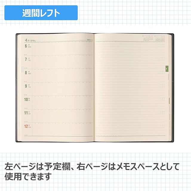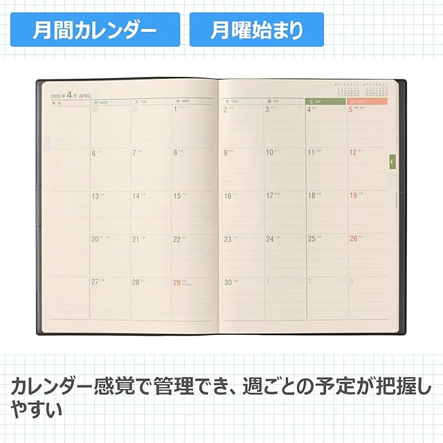 【商品説明】メモページがノート1冊分以上あり、手帳とノートを一括管理したい人におすすめの能率手帳【月間ページ】見開き1ヶ月のベーシックなブロックタイプ(月曜始まり)。カレンダーと同じような感覚で見ることができ、週ごとの予定が把握しやすいのが特徴です。【週間ページ】見開き1週間で左ページに予定、右ページはメモスペースとして使えるレフトタイプ(月曜始まり)。予定とメモにバランスの良い手帳です。