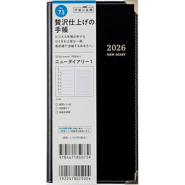 商品名:73 ニューダイアリー1 手帳 高橋書店 2026年版 黒 ウィークリー 手帳判