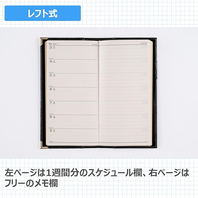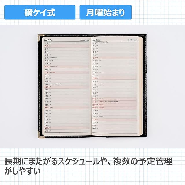 【月間予定欄:横ケイタイプ】1ページ1ヵ月の横ケイ式。出張など長期の予定も書き込みやすいです。 <BR>【週間予定欄:レフト式】左ページは各日の記入欄、右ページは罫線のシンプルなレフト式で、自由に使えます。