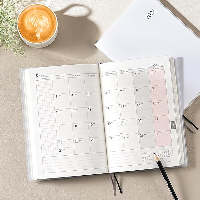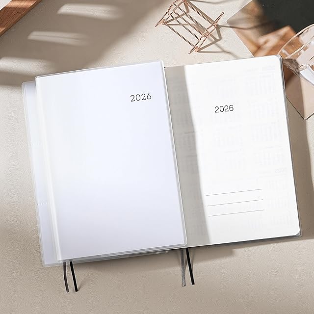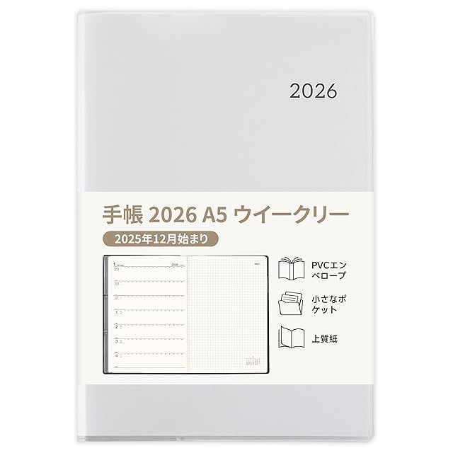 手帳 2026 A5 ウィークリー ダイアリー 月間ブロック PVC カバー 白色(2025年12月始まり)