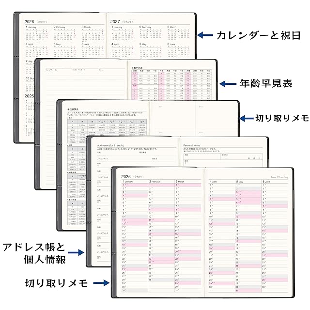 【内容】年度の概要, 月間ページ, 週間ページ,付録:年齢早見表, 単位換算表, ID・パスワードリスト, スコアリングメモ,方眼メモ, 切り取りメモ。