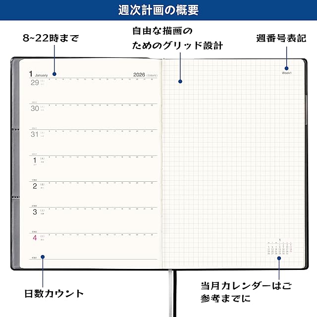【月間ページ】月間予定欄はブロックタイプを採用(月曜始まり)。週ごとの予定が一目でわかる。【週間ページ】左ペ-ジは予定欄、右ペ-ジはメモにとして使用できます。また、スケッチや図表作成に利用可能。