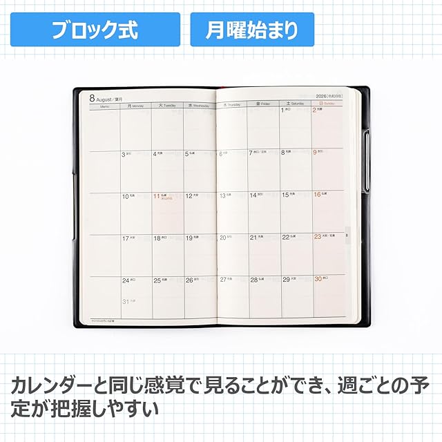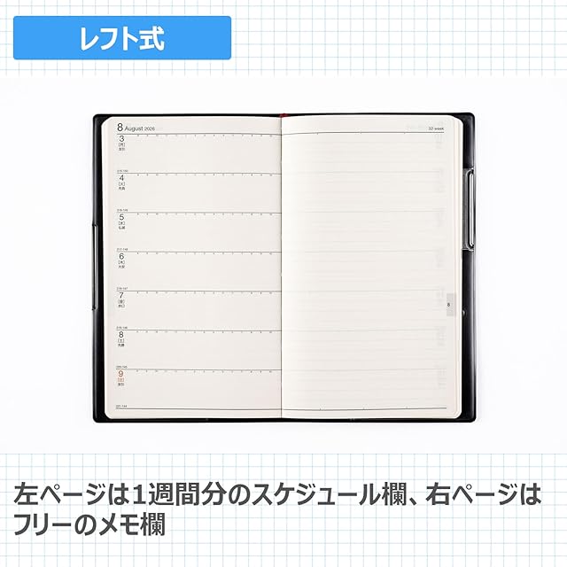 【月間予定欄:ブロックタイプ】曜日ごとの予定がすぐに一覧できるブロック式。 <BR>【週間予定欄:レフト式】左にスケジュール、右に罫線メモが付いているレフト式。仕事のメモや日記など、自由な使い方ができます。