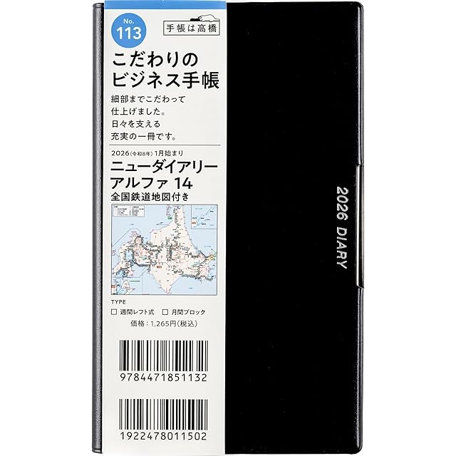 商品名:113 ニューダイアリーアルファ 14 全国鉄道地図付き 手帳 高橋書店 2026年版 黒 ウィークリー 手帳判