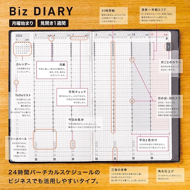 【レイアウト】 月間ブロック式・見開き1週間(24時間バーチカル)、月曜始まり