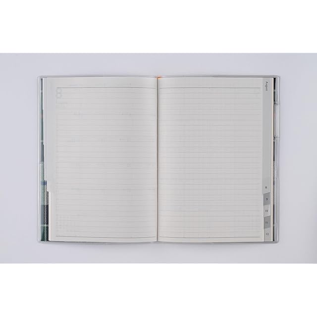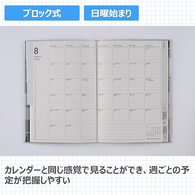 【月間予定欄:ブロックタイプ】使いやすいブロック式はインデックス付きで便利。 各月ごとに横ケイメモと方眼メモが2ページずつ付いているので、月間ページに書ききれなくても安心。