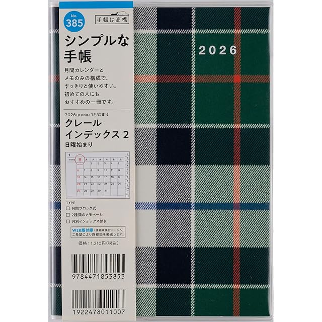 商品名:385 クレールインデックス2 手帳 高橋書店 2026年版 チェック マンスリー B6判