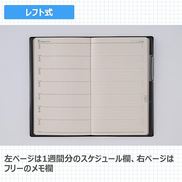 【月間予定欄:ブロックタイプ】曜日ごとの予定がすぐに一覧できるブロック式。 <BR>【週間予定欄:レフト式】左にスケジュール、右に罫線メモが付いているレフト式。仕事のメモや日記など、自由な使い方ができます。