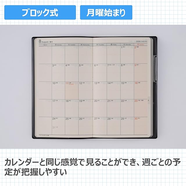 【商品詳細1】サイズ:幅9.7×高さ16.1cm 【記入欄】●月間ページ…ブロック式 ●週間ページ…レフト式 ◇月曜始まり 【掲載期間】月間ページ:2025年12月1日~2027年3月31日 週間ページ:2025年11月24日~2027年1月3日