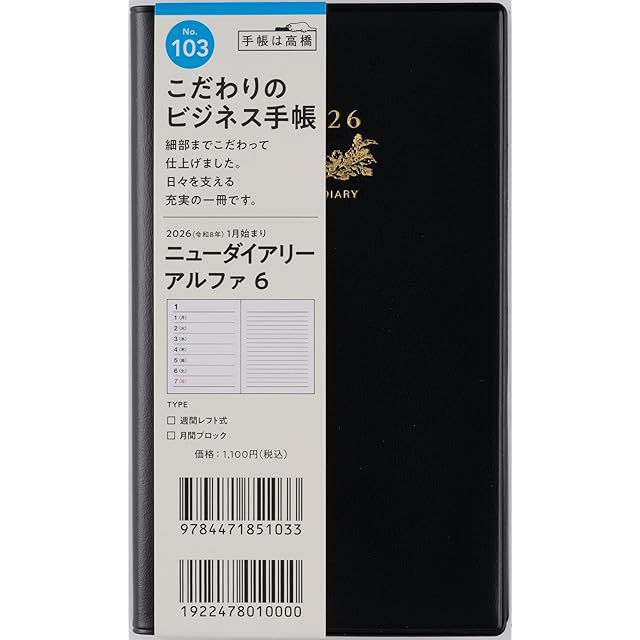 商品名:103 ニューダイアリーアルファ 6 手帳 高橋書店 2026年版 黒 ウィークリー 手帳判