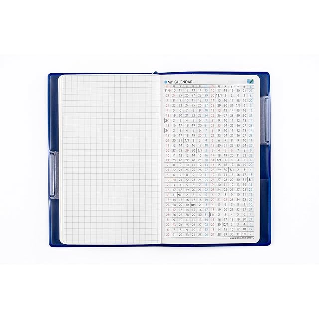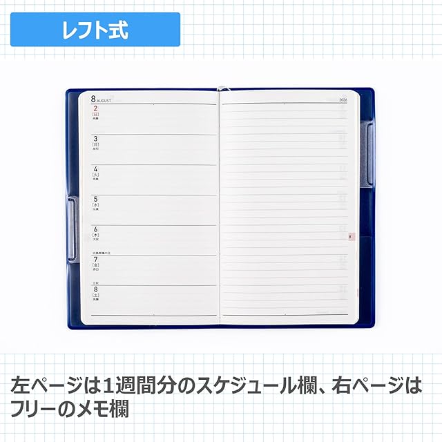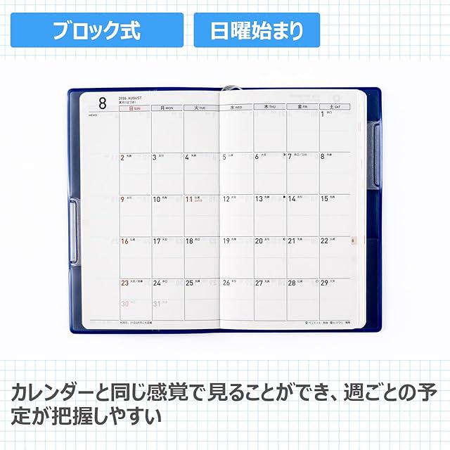 【月間予定欄:ブロックタイプ】カレンダーと同じ感覚で見ることができ、週ごとの予定が把握しやすい、日曜始まりのブロック式。左端の一列はフリーのメモ欄になっています。月間が巻頭にまとまっているので、前後月との流れが把握しやすく便利です。 <BR>【週間予定欄:レフト式】左ページは1週間分のスケジュール欄、右ページはフリーの横ケイメモの、日曜始まりのレフト式。スケジュール欄は時間目盛りがないので、時間に左右されず記入したいことをたっぷり書きこめます。