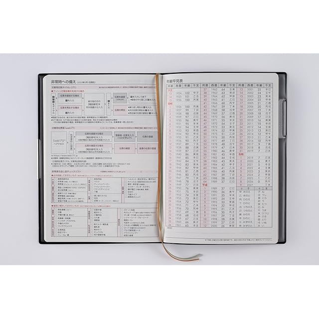 【商品詳細2】表紙タイプ:皮革調 ●刷色:2色刷 ●ページ数:192頁 ●スペック:ペンホルダー ●付録:年齢早見表,印紙税額一覧表,非常時への備え ●別冊:,横ケイメモ,方眼メモ,切り取りメモ