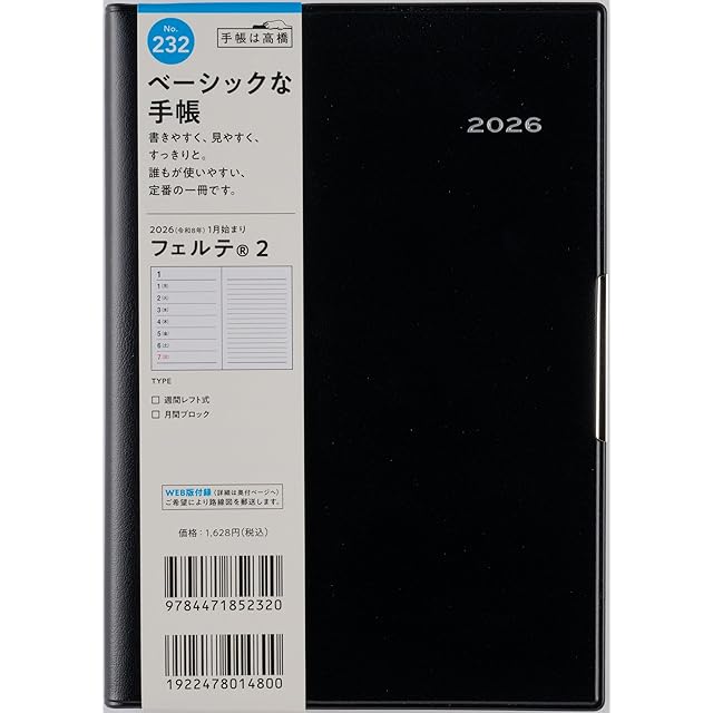 商品名:232 フェルテ2 手帳 高橋書店 2026年版 黒 ウィークリー B6判
