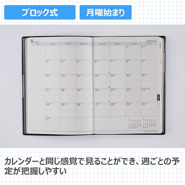 【月間予定欄:ブロックタイプ】カレンダーのような感覚で使え、週ごとの予定が把握しやすいブロック式。左端にはメモスペース、右下には前次月のカレンダーが付いています。 <BR>【週間予定欄:レフト式】左ページは1週間分のスケジュール欄、右ページは横ケイメモ。スケジュール欄にはタイム目盛りも付いていて、予定をしっかり管理できます。
