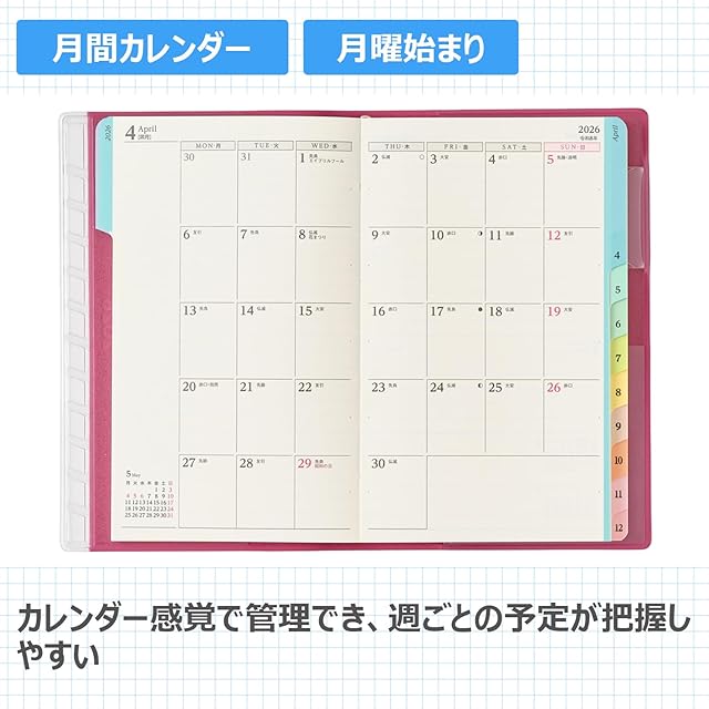 【商品説明】カラフルなインデックスが人気のPAGEM by NOLTY(ペイジェム バイノルティ)のウィークリー手帳シリーズ。ライフログにもおすすめです。【月間ページ】見たいページがパッと開けるインデックス付き(月曜始まり)。【週間ページ】見開き1週間で、左右のページに日付が分割されているメモタイプ。1日分のスペースが広いので、日記や食事の記録などに便利です。販売終了となった1508・1509 NOLTYポケットカジュアル2(グレイドネイビー・ピンク)や2213・2214 ペイジェムウィークリーA6-iメモ月曜(ピンク・グレージュ)の代替品としてもおすすめいたします。モデルチェンジ:●扉デザインを変更しました※表紙を変更しました