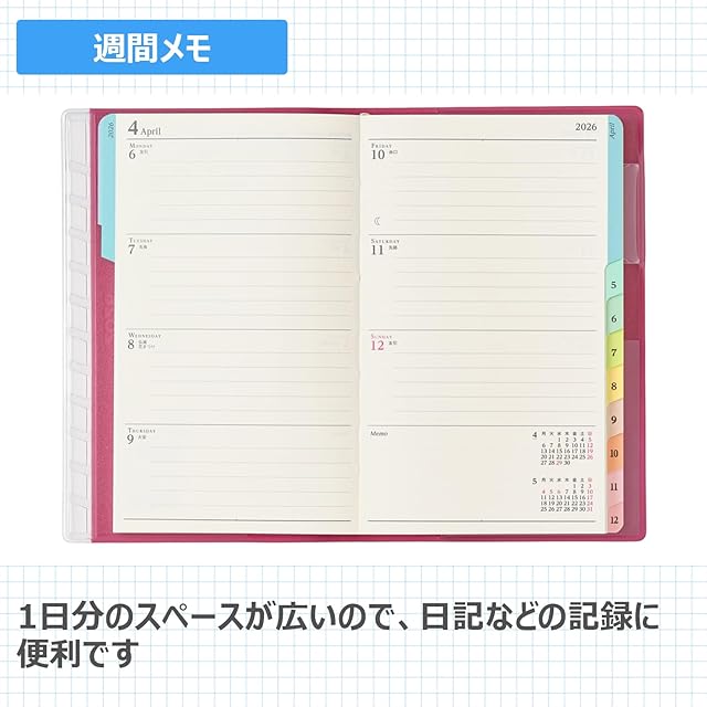 【商品詳細】サイズ:152mm × 97mm × 15mm / ページ数:224 / 月曜始まり / レイアウト:カレンダー + メモ / 用紙色:ホワイト用紙 / 掲載資料(本冊):ヘルスチェックカレンダー・サイズチャート・年齢早見表 掲載資料(分冊):テレフォン情報・郵便情報・アドレス・ID・PWリスト