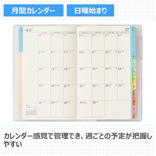 【商品詳細】サイズ:152mm × 97mm × 15mm / ページ数:224 / 日曜始まり / レイアウト:カレンダー + メモ / 用紙色:ホワイト用紙 / 掲載資料(本冊):ヘルスチェックカレンダー・サイズチャート・年齢早見表 掲載資料(分冊):テレフォン情報・郵便情報・アドレス・ID・PWリスト
