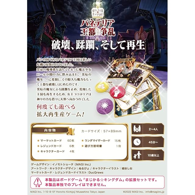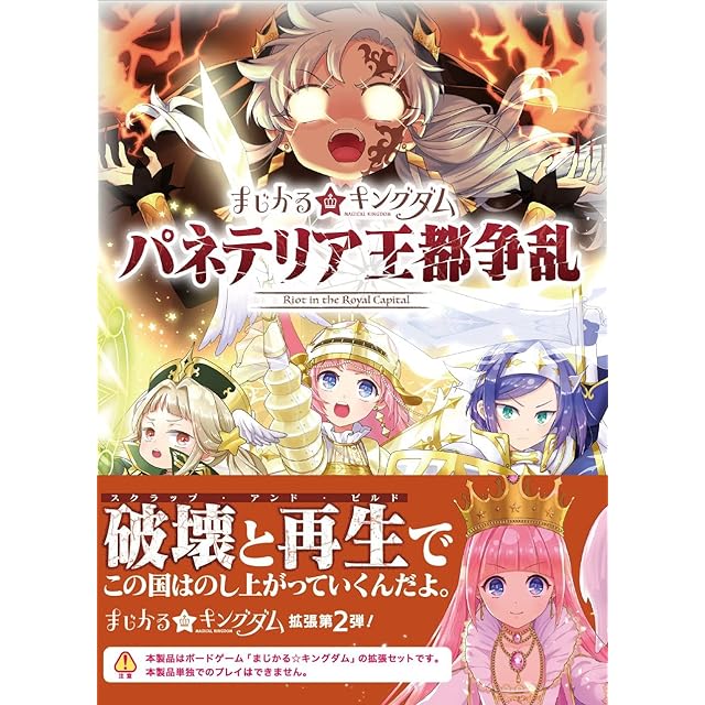 ※本製品はボードゲーム「まじかる☆キングダム」の拡張セットです。本製品単独でのプレイはできません。大人気ボードゲーム『まじかる☆キングダム』の拡張セット第二弾。この拡張セットは、パンの国であるパネテリア王国内の内乱がテーマです。システムコンセプトは『スクラップ&ビルド』。一度自分が建てた建物を破壊し、パワーを獲得していきます。パンの国であるパネテリア王国で、禁忌の魔導書を研究していたとある魔法少女は、その心を災厄の魔女に乗っ取られてしまいました。 女王コロネリアはその内乱を止めるため、神の力を借りに天界へと向かうのでした。ゲームジャンル:王国運営(拡大再生産) つくろう、理想の王国を! サイコロとパワーを駆使し、建築物や組織を増やし、最強の王国をつくりあげよう。知略、策謀、運が交錯する、王国発展・拡大再生産ゲーム!