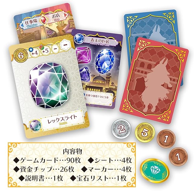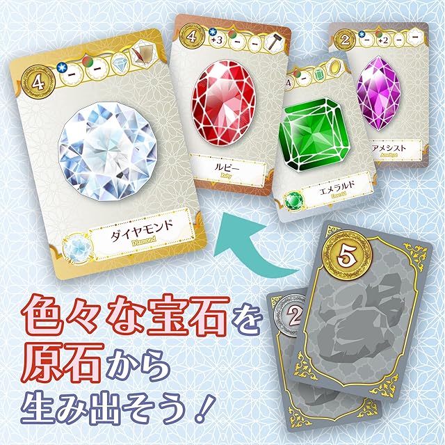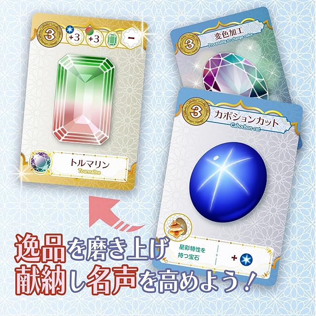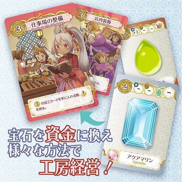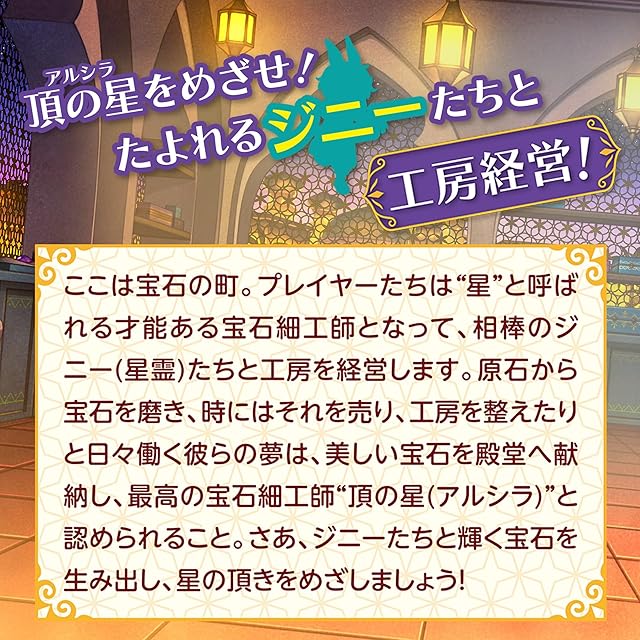 色々な宝石を原石から生み出し、資金に換えよう!資金で工房を経営、さらなる逸品を献納し名声を高めてジニーたちと最高の宝石細工師“頂の星”(アルシラ)をめざすボードゲーム