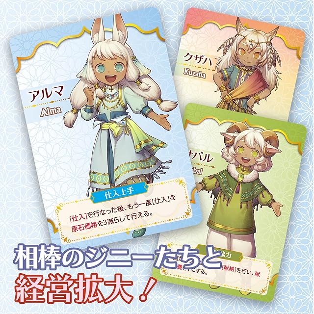 本製品は2~4人用の宝石工房経営ゲームです。舞台は宝石の町。プレイヤーたちは“星”と呼ばれる才能ある宝石細工師となって相棒のジニー(星霊)たちと工房を経営します。原石から色々な宝石を生み出し、時には売って資金に換え、工房を整えたり、さらに高級な原石を仕入れたりと様々に工房を盛り立てます。日々働く彼らの夢は美しい宝石を殿堂へ献納し、名声を高めて最高の宝石細工師“頂の星(アルシラ)”と認められること。さあ、ジニーたちと星の頂きをめざしましょう! プレイ人数:2~4名/プレイ時間:30分~/ゲームデザイン:吉池真一(Gemini Games)/イラスト:里瀬ほとり,kawakami