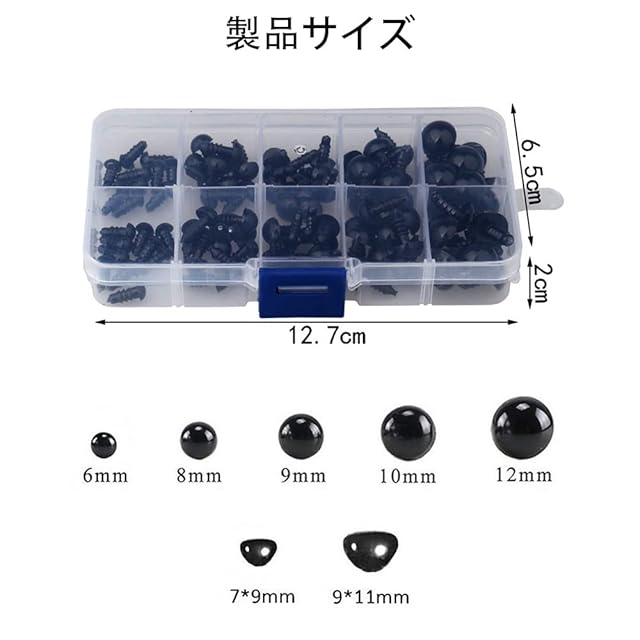 "1.【人気な手芸用品】:さし目の人形の作り方、使い方は色々!羊毛フェルト さし目、猫 さし目、さし鼻、休日の工芸品の装飾やそれ以上に人生を楽しくなるための偉大なことです。 2.【使い方簡単】:差込み式のものの本体に目打ちで穴を開け、そこに差込み、ボンド接着して留めます、「編みぐるみ」など穴(編み目)が大きいものは、抜けないように生地などで補充をしてお使いください、 生地の補充:立体にする前に目の位置に裏から同色の布を当て、その布に穴を開け、目と本体を接着します。 3.【安全な材料】表面は非常に滑らかです、無味で、非常に安全な製品です、黒いプラスチック製の目玉の非毒性かつ実用的です。 4.【収納ボックス付き】プラスチック製の収納ボックスが付いておるから、色んな目玉をちゃんと収めています。そんなに多くの目玉がばらばらに散らばることを心配せず、ご安心に使用してください。 5.【パッケージ内容】6mm/8mm/9mm/10mm/12mm/7*9mm 各20個ずつで、9*11mm 15個 約135個/箱。 "