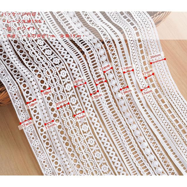 製品情報:長さ、単位長さ1m、総長15m;幅、13mm~26mm(参考画像を確認してください)。色,ホワイト;款式,15種類入り。
