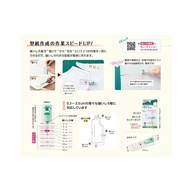 0.3~3.5cmの様々な 縫いしろ 幅 に対応しています。 脇線 や 裾線 など、 直線 定規 では書きにくいゆるやかな カーブ も簡単に 作業 できます。