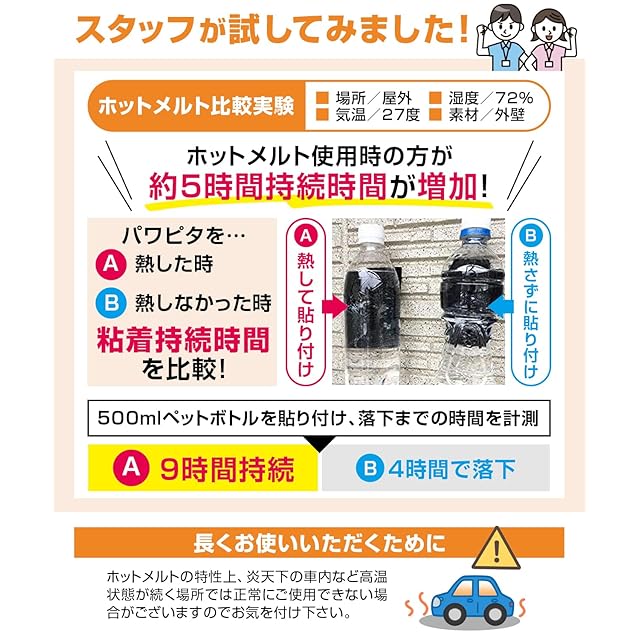 ✅【安心のホットメルト素材】ホットメルトは食品の包装にも使用される、有機溶剤を使わない環境に優しい素材です。ドライヤー等で1~2分熱すると強度が増す仕組みで、他のマジック 付き テープでは使えない外壁にも使用可能です。※耐熱は約70度ですが、素材の特性上約50度からホットメルトが溶け始めます。高温状態が長時間続く環境では正常にご使用できない場合がございますので、使用環境を確認の上ご使用下さい。