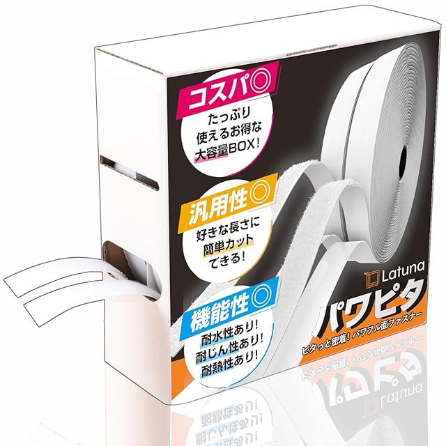 ✅【専用収納BOXで利便性UP!】取り出しにも収納にも便利な、専用BOXが付いてきます!使いたい分だけサッと引き出してカット、使い終わったら穴に差し込んでスッと収納。専用箱に入れておけば、ロールがバラバラにほどけることもないのでストレスフリーです。Latuna(ラチュナ)のパワピタ面ファスナーでワンランク上の使いやすさを試してみませんか?