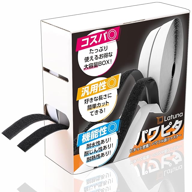 ✅【専用収納BOXで利便性UP!】取り出しにも収納にも便利な、専用BOXが付いてきます!使いたい分だけサッと引き出してカット、使い終わったら穴に差し込んでスッと収納。専用箱に入れておけば、ロールがバラバラにほどけることもないのでストレスフリーです。Latuna(ラチュナ)のパワピタ面ファスナーでワンランク上の使いやすさを試してみませんか?