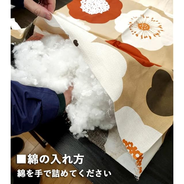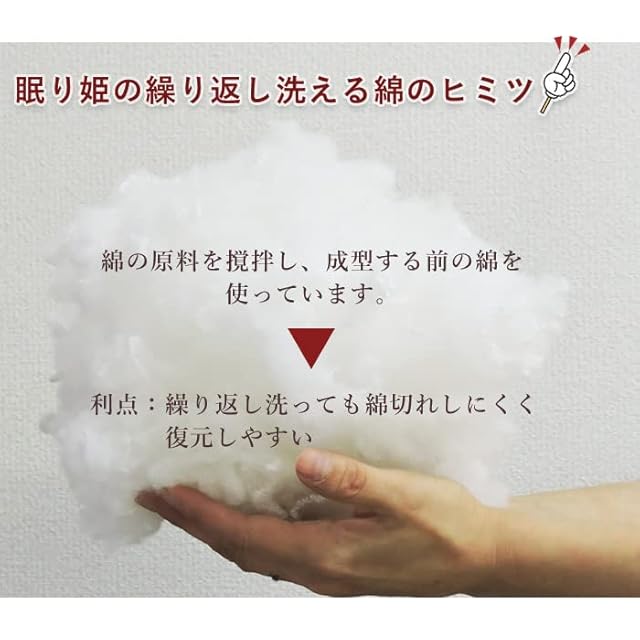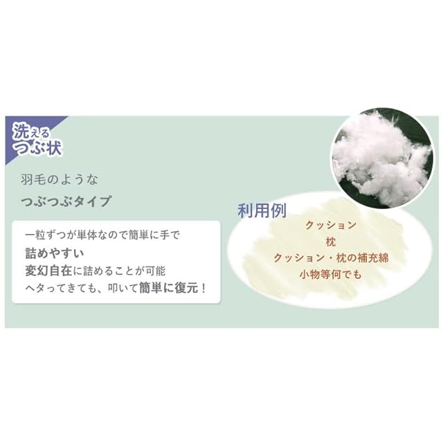 日本製の良質な洗える綿を使用しています。洗ってもふっくらふわふわ、抗菌防臭効果が続きます。つぶ状なので、パンパン叩くことで元通りに復元します。