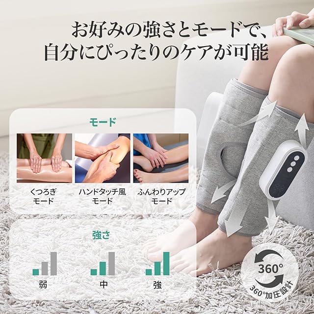【3種類加圧モード・3段階強さ調節】自分の状態や気分に合わせて選べる3種類の空気圧モードを搭載。さらに各モードごとに3段階の強さ調節が可能で、リラックスしたい時や運動後のケア、立ち仕事や長時間のデスクワークで疲れた足など、あらゆるシーンに対応します。また、デスクワーク中やテレビ・読書をしながらでも、足首からふくらはぎ全体をやさしく包み込み、手軽にケアできます。