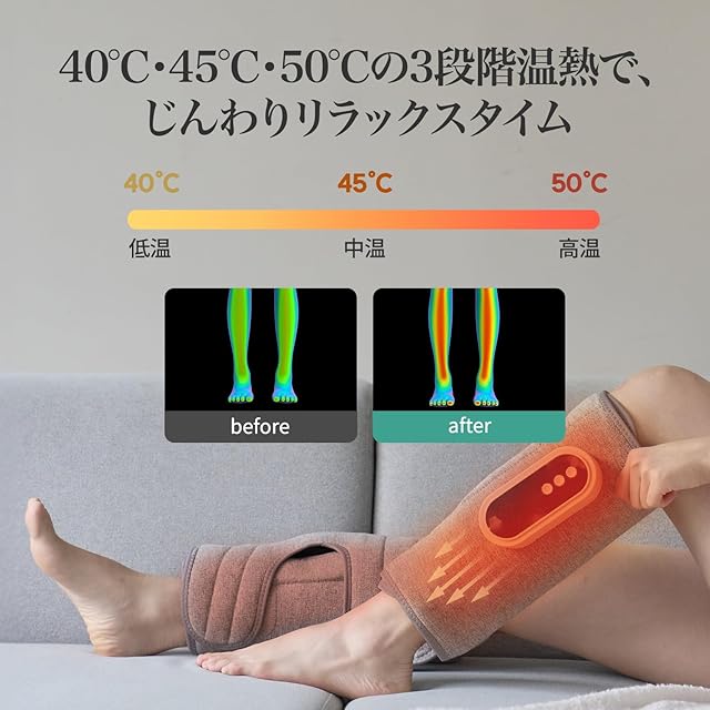 【3段階温感機能&15分自動オフ搭載】ふくらはぎケアには温熱機能を搭載しており、低温(約40℃)、中温(約45℃)、高温(約50℃)の3段階からお好みに合わせて選択可能です。温かさで足を包み込むことで、心地よくケアでき、すっきりとした使用感を感じやすくなります。在宅ワークや座りっぱなしの時間が長い方は、気づかないうちに足が冷えてしまうことがありますが、本品で簡単に温めながらケアできます。さらに15分のオートオフ機能を搭載しているため、使いすぎや消し忘れの心配もありません。