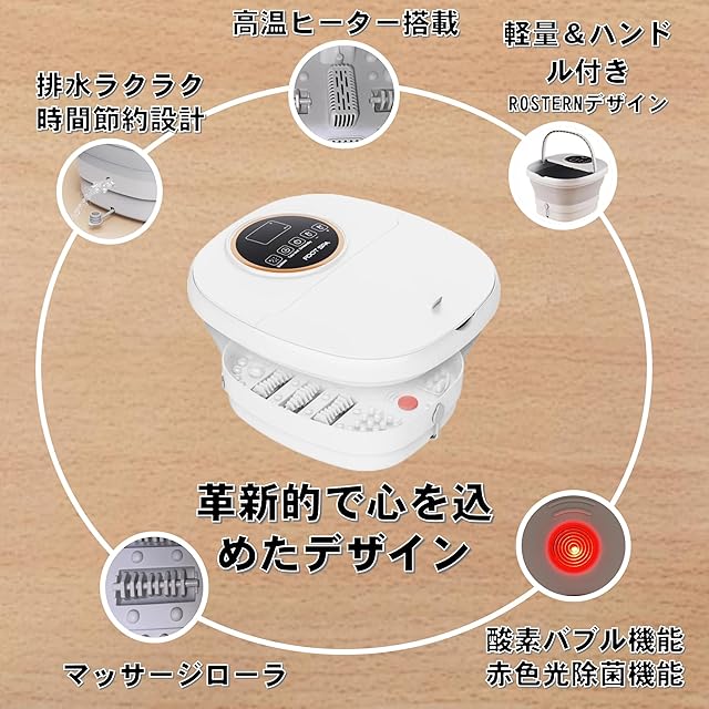 用途:足湯・フットバス・足の疲れ・むくみ・冷え対策 電源方式:電源コード式(安定加熱タイプ) 材質:高品質TPE素材(折りたたみ式でも丈夫で⾧持ち) ブランド:Rozeta カラー:ホワイト(シンプルで清潔感のあるデザイン) サイズ:40×35×25cm/重量:約2.2kg 特徴:折りたたみ収納・軽量設計・リモコン付き