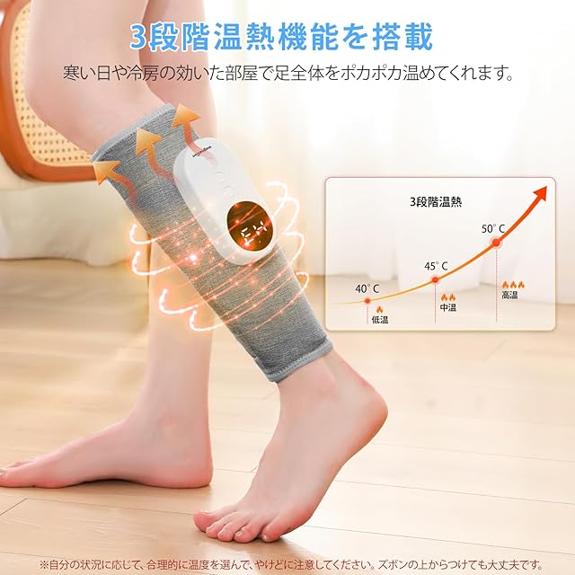 【3段階温感ほぐし・15分自動オフ機能】:ふくらはぎを心地よい温度でケア。温度は低温(40°)、中温(45°)、高温(50°)の3段階調節可能で、冷えが気になる季節も足元からじんわりポカポカ。オフィスの冷房や冬場の「冷え足」を和らげ、全身のリラックスを促します。温感機能をお好みで切り替え可能!衣類の上からも使用でき、15分の自動オフ機能付きで安心。