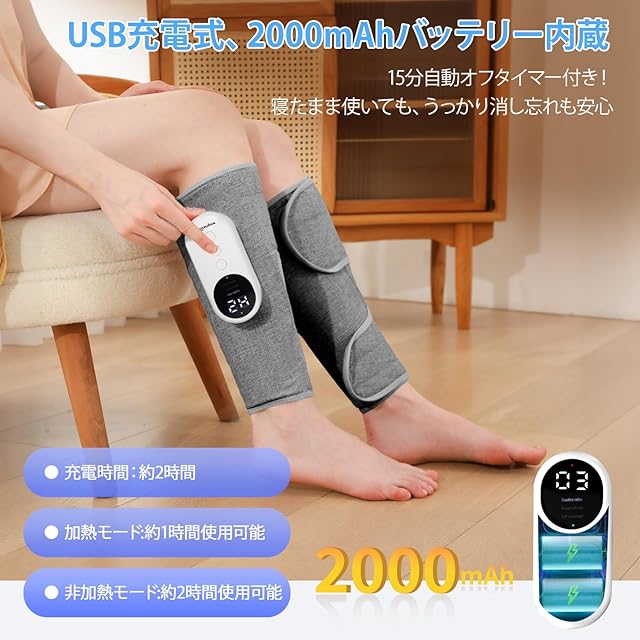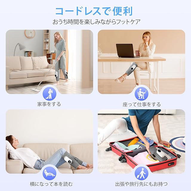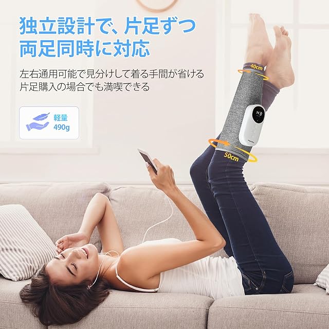 【コードレスUSB充電式】便利なコードレスタイプ、デスクワークや家事など「ながら使用」が可能。いろんなシーンでもっと自由に脚リフレッシュができます。2000mAhの大容量バッデリーを搭載し、1回の充電で約2時間使用が可能です。(充電時間は約4時間)。各ユニット重量はわずか0.5kg。マジックテープで最大50cmの脚囲にフィットします。