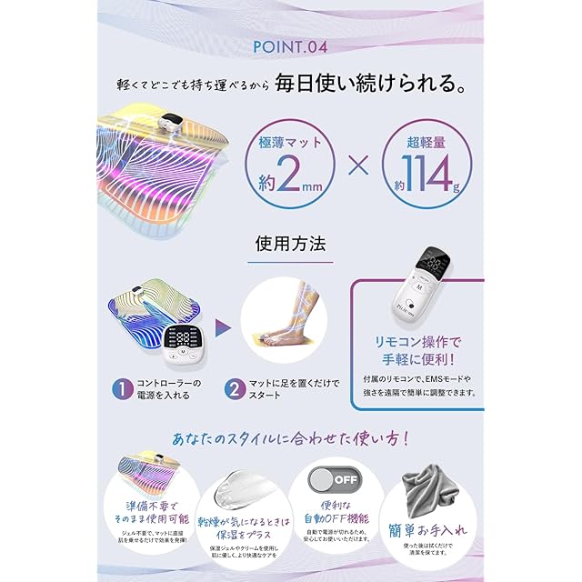 【軽量&タイマー機能】:二つ折りができるので、省スペースで場所を取りません。重さは約114g(本体+リモコン)で、フットマットの薄さはわずか約2mmの超軽量設計です。
